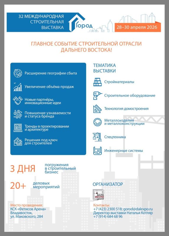 32-я международная строительная выставка «Город» пройдёт во Владивостоке с 28 по 30 апреля 2026 года
